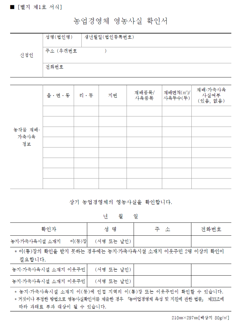 영농업 확인증은 아래 그림과 같습니다. 제출 시 반드시 통장(통장)의 서명 또는 날인을 받아야 하며, 수령이 불가할 경우 인근 주민 2인에게 발급받아야 합니다.