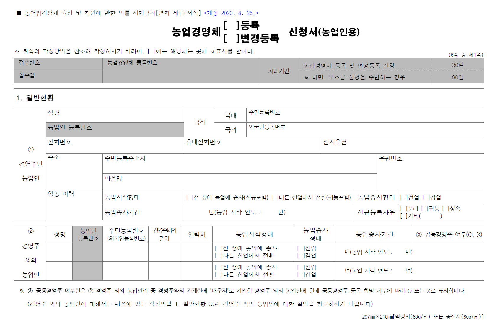 농업 사업자 등록 신청서는 대략 아래 그림과 같습니다. 저 한 페이지가 끝이 아니라 뒤에 몇 페이지가 더 붙어 있어서 조금 더 쓸 일이 있다.