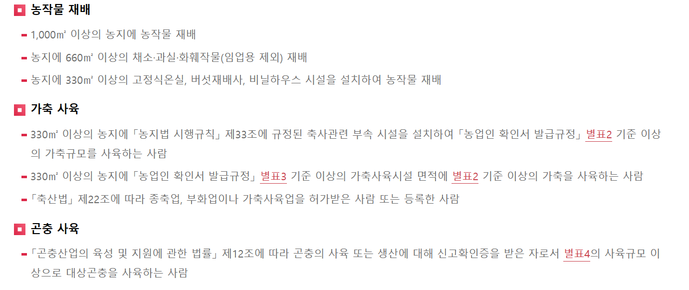 등록요건은 농작물, 가축, 곤충사육에 따라 구분된다. 작물 재배에서도 품목에 따라 세부 만족도 기준이 다르다. 그러나 등록 요건 자체의 허들은 높거나 그런 것이 아닙니다.