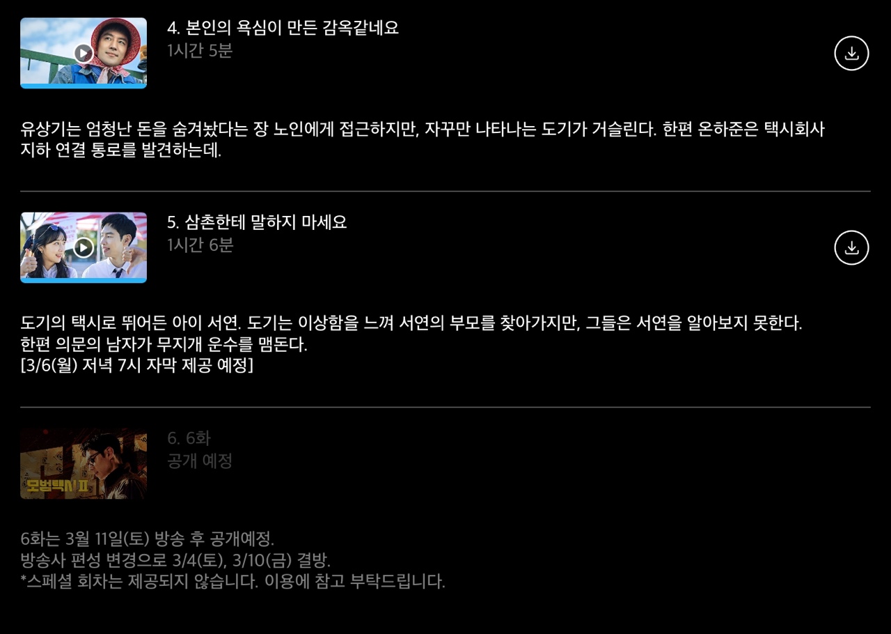 쿠팡플레이를 통해 디센트택시2를 시청하면 4일 방송되는 특집이 제공되지 않으니 반드시 시청해야 한다.