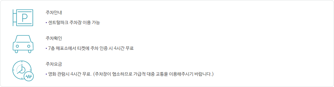 - 영화 감상 시 4시간 무료. (주차공간이 협소하오니 가급적 대중교통을 이용하여 주시기 바랍니다.)