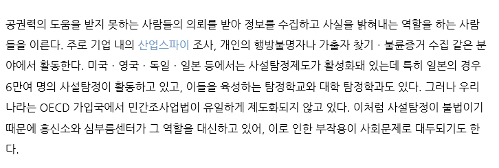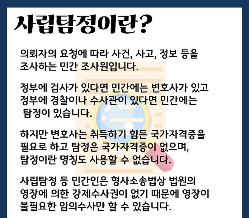 먼저 탐정은 유망한 직업에 속해 있고 실제로 어떤 직업입니다. 만화나 드라마, 영화에서나 등장하는 직업이 실제로 있다는 말에 당황하실 수도 있어요! 아니면 불법적인 업무를 하는 것 같은 느낌이 들 수도 있어요. 이것은 모두 소문에 의한 이야기입니다. 해당 직업이 실제로 하는 업무는 경찰과 검찰을 돕는 공조적인 업무를 수행하고 있습니다. 또한 개인의 의사로 업무까지 맡아 단독 수사도 펼칠 수 있기 때문에 생각보다 자유롭고 주저 없는 업무를 진행할 수 있습니다.