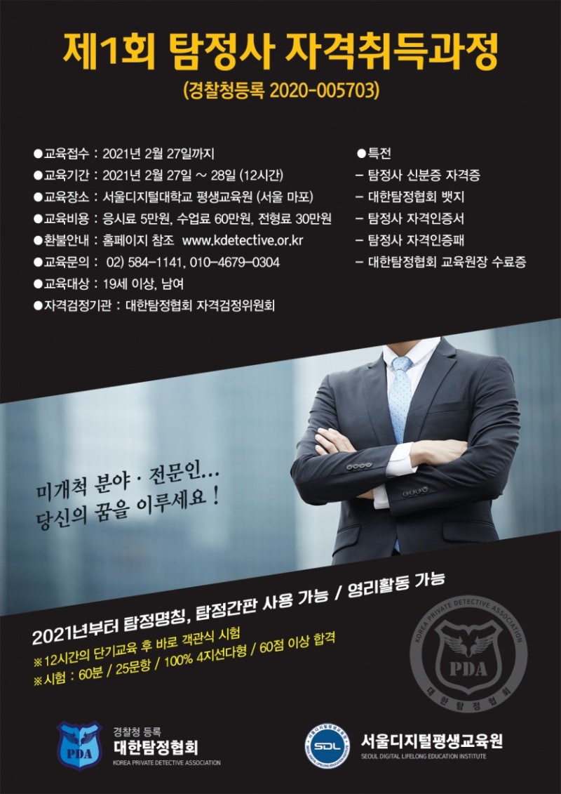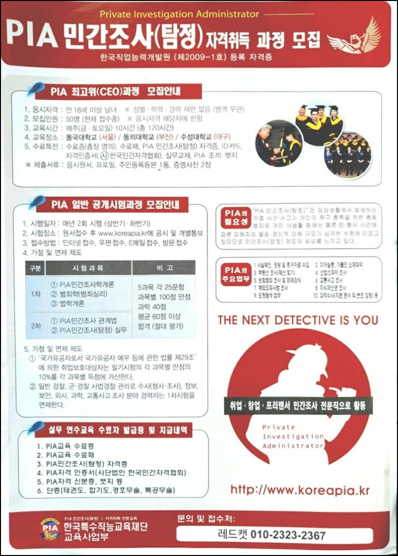 탐정 자격증은 현재 정식 명칭으로는 PIA 사설 탐정사라고 불립니다. 원래는 일반인들이 탐정이라는 단어를 사용할 수 없었는데요. 최근 신용정보보호법 제40조 2항 4항의 개정·삭제가 이루어져 2020년 8월 5일부터는 정식 명칭을 받아 민간조사자 자격으로 거듭날 수 있게 되었습니다. 그리고 경호학이나 경찰행정학 등에 재학중인 학생들에게는 업무와 관련이 있고 스펙도 된다고 합니다!