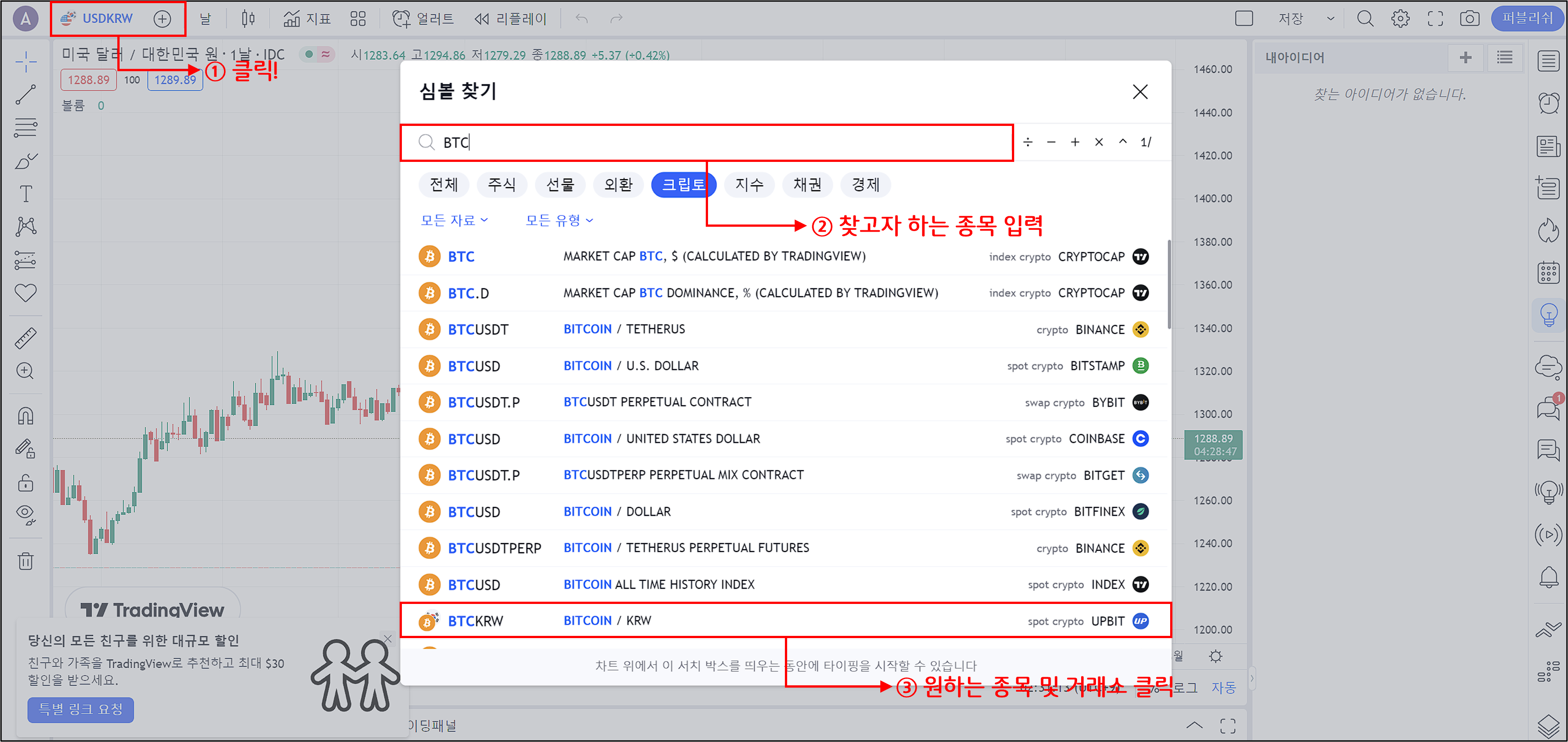 ③ 아이템 목록이 표시되면 보고 싶은 거래소에 따라 아이템을 선택합니다. 예는 업비트에 속합니다.