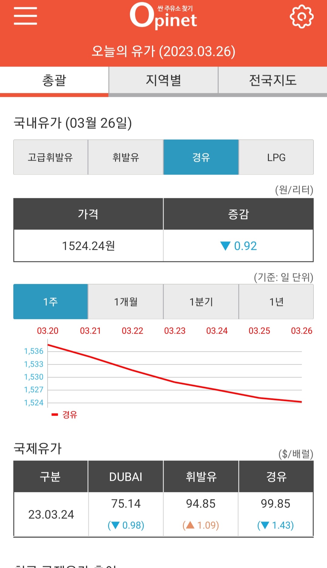 “다음 주에는 국내 유가도 약세를 보일 것입니다.오피넷 어플리케이션을 이용하시면 오늘의 유가, 국내 유가, 국제 유가, 휘발유의 경우 LPG를 판매하는 지역 내 가장 저렴한 주유소를 알 수 있습니다.